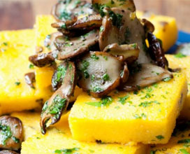 Grigliate le fette di polenta, ponetevi sopra le cappelle ripiene e servite.